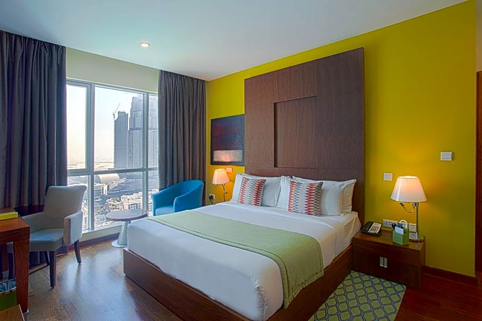 This is a spacious one-bedroom suite in contemporary interior design and bright accents measuring 75 square yards. Its large stationary window lets in the maximum natural light and the magnificent view of Burj Khalifa, Dubai Fountain, and The Dubai Mall. This room has a large bathroom with a walk-in shower and a separate bathtub with a bidet complete with toiletries, sets of linen, a hairdryer, magnifying mirror, and a bathroom scale. The living room has a 5-seat sofa set with an LED TV. It provides the comfort of one's home with complimentary Wi-Fi access on an unlimited number of devices, a qibla, iron & board, a fully-equipped kitchen with a countertop complete with refrigerator, dishwasher, microwave, toaster, coffee & tea facilities, utensils, 3-seat dining, and washing machine. The separate bedroom has a work desk, a luggage rack, a 2-seat coffee table, a large wardrobe, and its own LED TV.