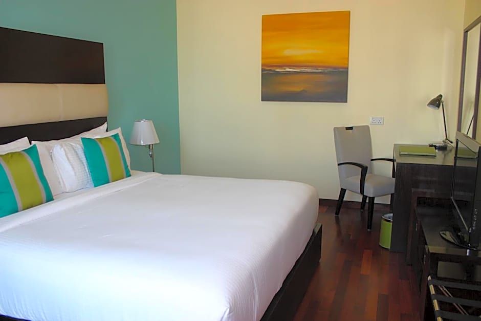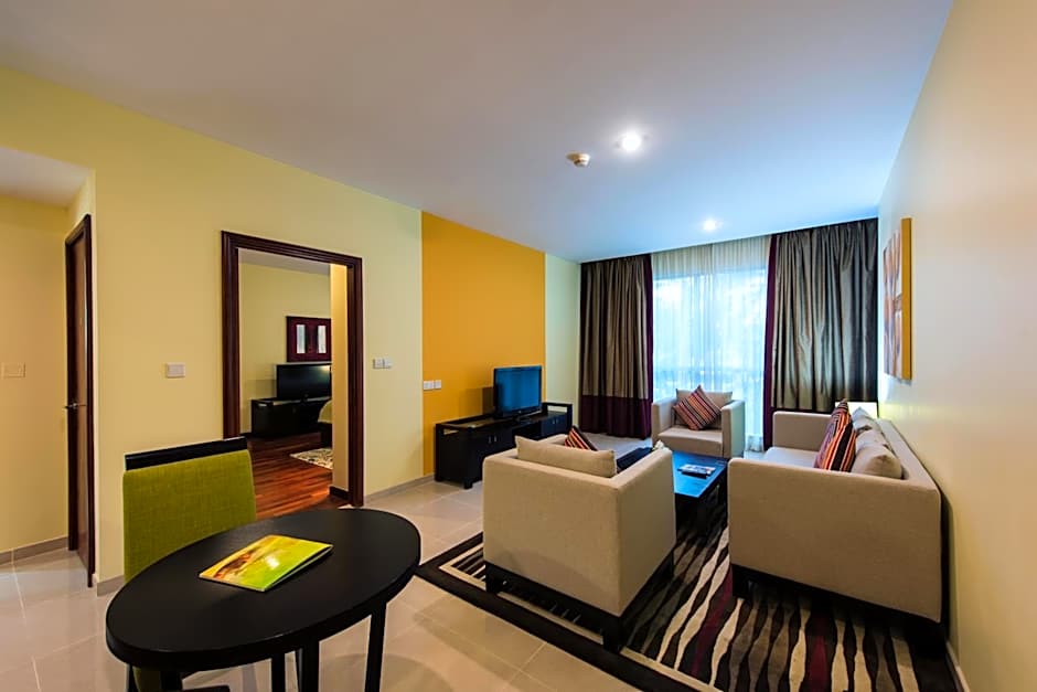 This is a spacious one-bedroom suite in contemporary interior design and bright accents measuring 75 square yards and has wide wheelchair-accessible doors with lowered peepholes. Its large stationary window lets in the maximum natural light and the view of Burj Khalifa and the garden. The living room has a 5-seat sofa set with an LED TV. It provides the comfort of one's home with complimentary Wi-Fi access on an unlimited number of devices, a qibla, iron & board, a fully-equipped kitchen with a countertop complete with refrigerator, dishwasher, microwave, toaster, coffee & tea facilities, utensils, 3-seat dining, and washing machine. The separate bedroom has a work desk, a luggage rack, a 2-seat coffee table, a large wardrobe, and its own LED TV. This room has a large bathroom with clear floor space for the most convenient movement and handrails at every point for motion assistance. You will find a roll-in shower with a seat, a lowered toilet seat, an open washbasin, and a separate bathtub with a bidet complete with toiletries, sets of linen, a hairdryer, magnifying mirror, and a bathroom scale. Both the bathroom and bedroom have an audible and light indicator alarm facility installed.