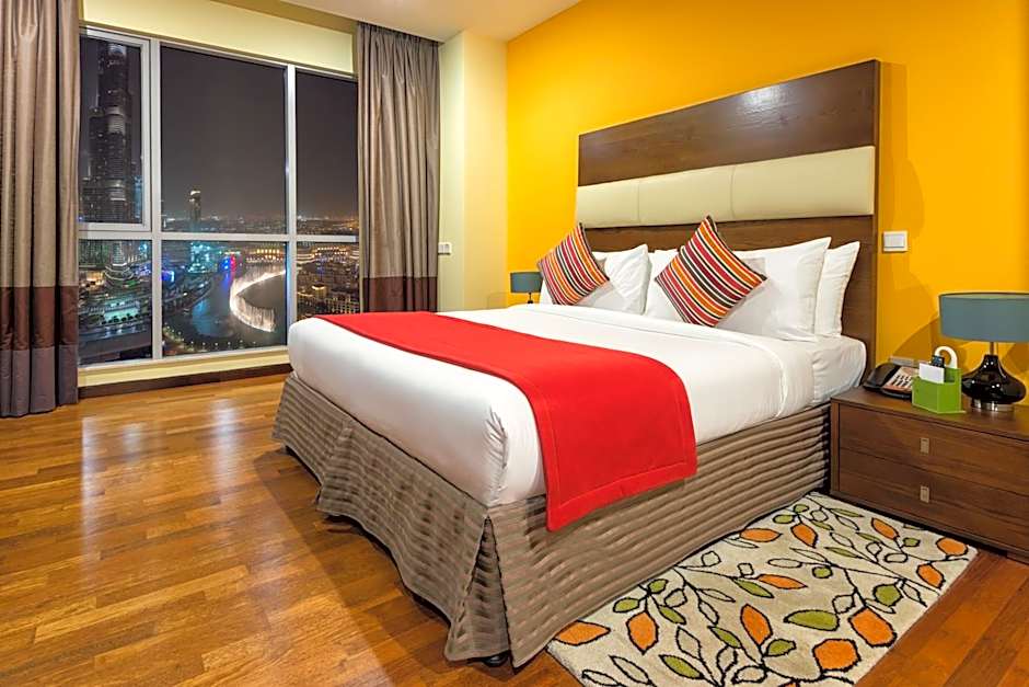 It is a 130 square yard spacious suite in a contemporary interior with a large stationary window that lets in the maximum natural light and the magnificent view of Burj Khalifa, Dubai Fountain, and The Dubai Mall. Its living room has a 6-seat sofa set with an LED TV and a powder room. This room provides the comfort of one's home with complimentary Wi-Fi access on an unlimited number of devices, a 6-seat dining, 2-seat coffee table, laundry & dryer, iron & board, a fully-equipped kitchen with a countertop complete with utensils, refrigerator, dishwasher, microwave, toaster, and coffee & tea facility. The two separate bedrooms have a large wardrobe, luggage rack, an LED TV and a bathroom. The master bedroom has a large bathroom with a walk-in shower and a separate bathtub complete with toiletries, sets of linen, a hairdryer, magnifying mirror, and a bathroom scale. It has a balcony overlooking the Downtown district with a coffee table for 2 to provide more space for relaxation.