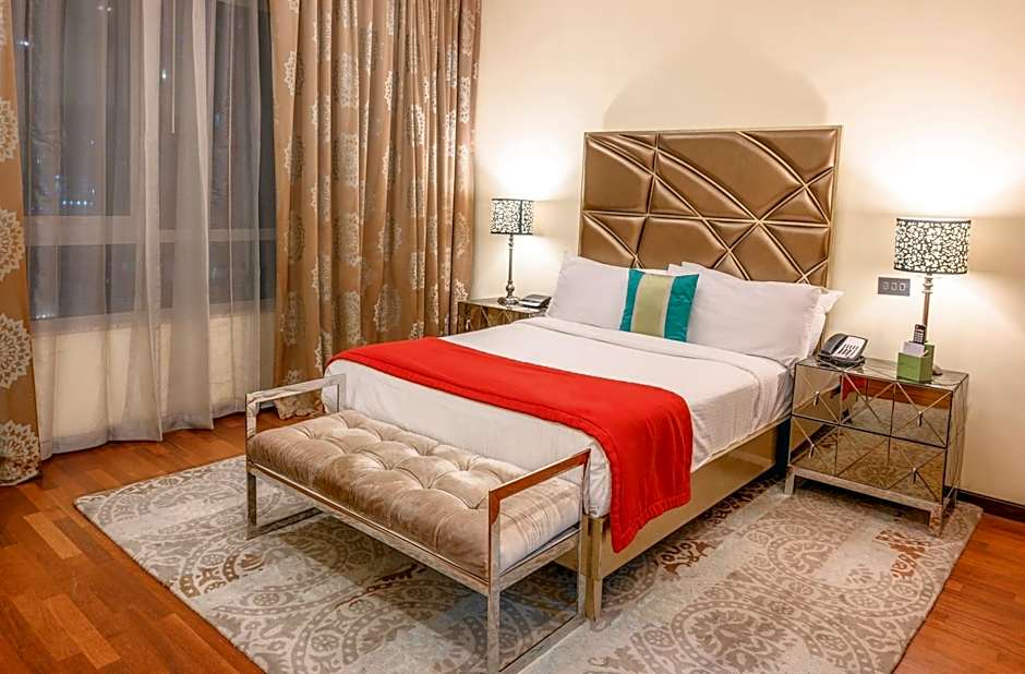 This 95 square yard one-bedroom suite has a contemporary interior design with bright accents overlooking Business Bay from its wide stationary window that lets in the maximum natural lighting with the city landscape view. Its living room has a 5-seat sofa set with an LED TV and a work desk. It has a large bathroom with a walk-in shower, a separate bathtub with a bidet complete with toiletries, sets of linen, a hairdryer, a magnifying mirror, and a bathroom scale. The room provides the comfort of one’s home with complimentary Wi-Fi access on an unlimited number of devices, a qibla, a fully-equipped kitchen with a countertop complete with refrigerator, dishwasher, microwave, toaster, coffee & tea facilities, utensils, a 3-seat dining table, and washing machine. The separate bedroom is complete with iron & board, a luggage rack, a work desk, coffee table, wardrobe, and an LED TV. It has a balcony with a coffee table for 2 to provide more space for relaxation.