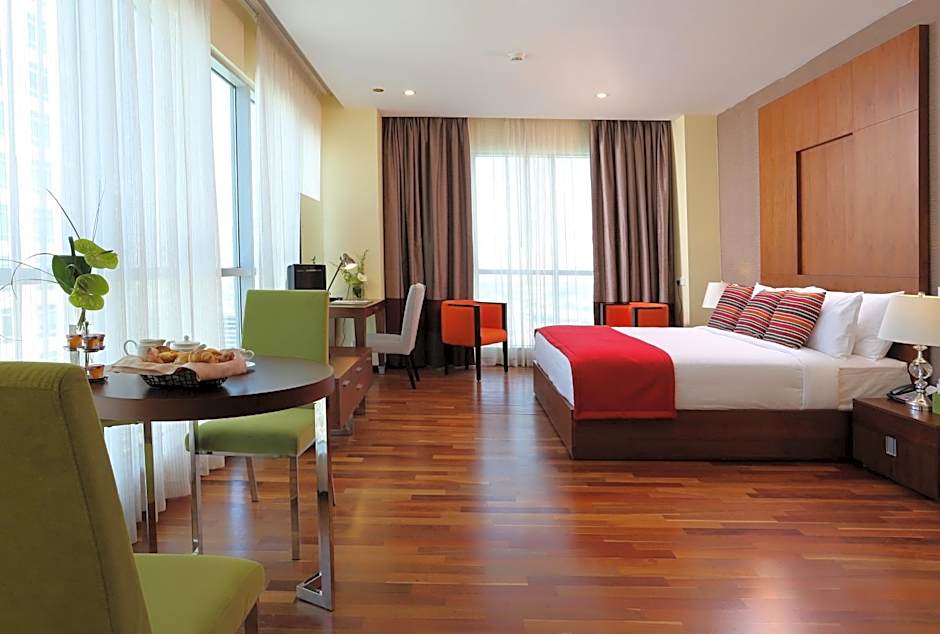 This is a studio-type suite of 55 square yards with more space than any standard deluxe hotel unit that can accommodate two adults and one child. It has a simple but elegantly designed interior with a large stationary window that lets in the maximum natural light and the magnificent views of the famous Burj Khalifa, Dubai Fountain, the Dubai Mall, and the Downtown district. It has a large bathroom with a walk-in shower and a separate bathtub with a bidet complete with toiletries, a set of linen, a hairdryer, a magnifying mirror, and a bathroom scale. The room provides the comfort of one’s home with complimentary Wi-Fi access on an unlimited number of devices, 2-seat dining, an LED TV, a qibla, iron & board, a luggage rack, a washing machine, an open plan kitchen complete with a refrigerator, microwave, toaster, coffee & tea facilities, dishwasher, and utensils.